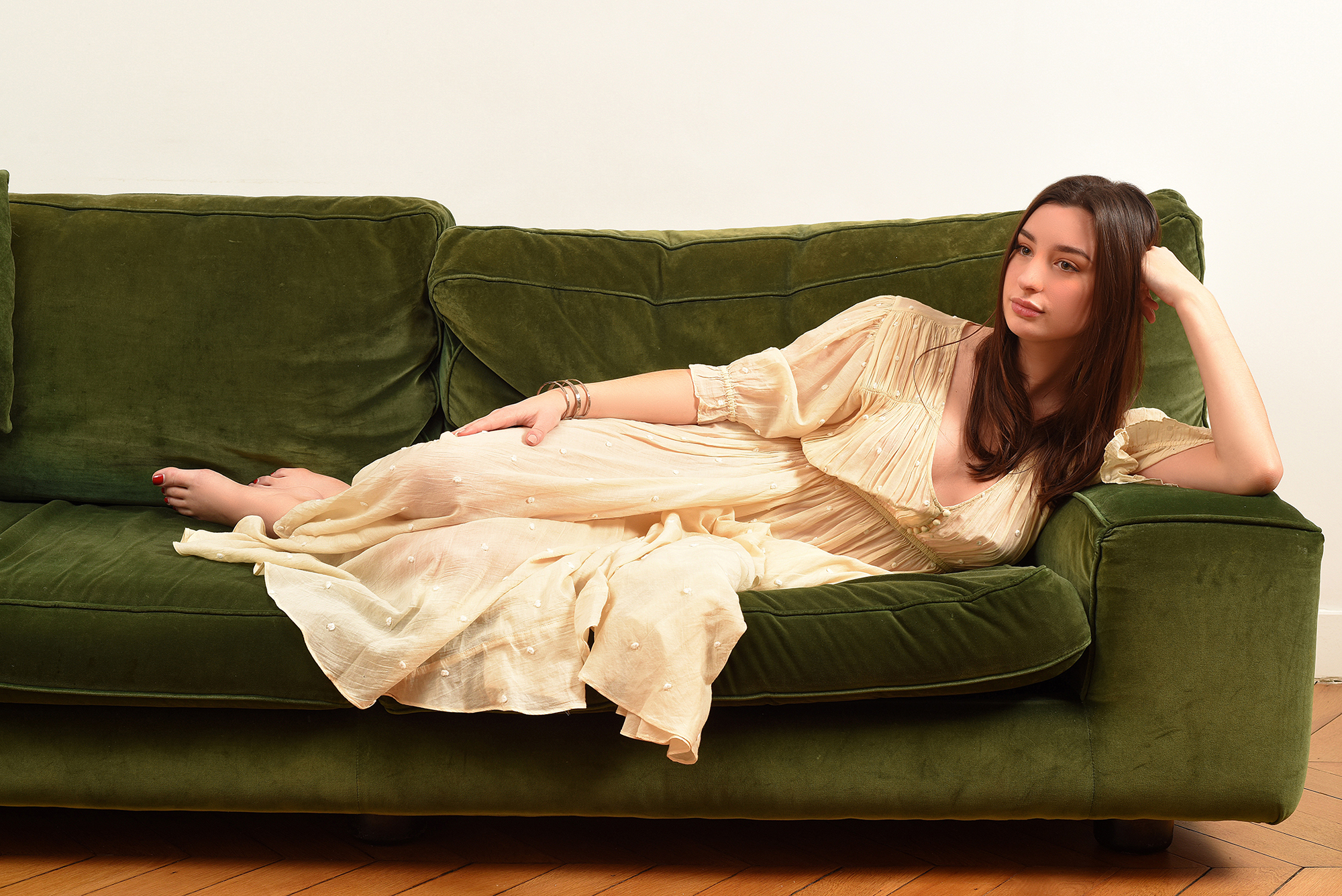 Embroidered swiss dots dress in a very light sheer voile