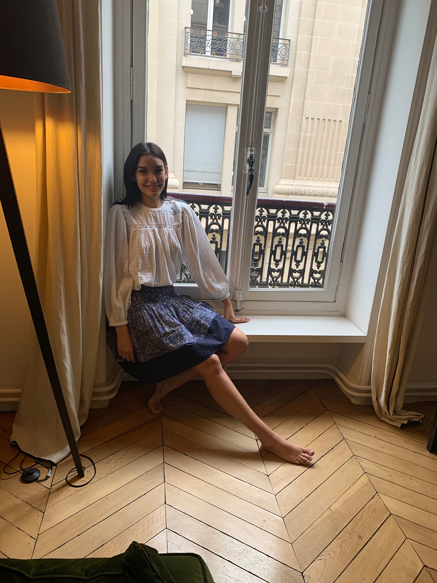 Blouse in double gauze with vintage embroidery & printed skirt in exclusive design