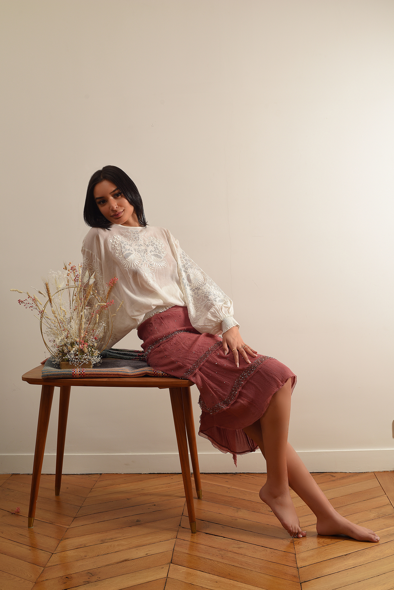 Muslin skirt with sequins, embossed 3d effect cutwork embroidered top